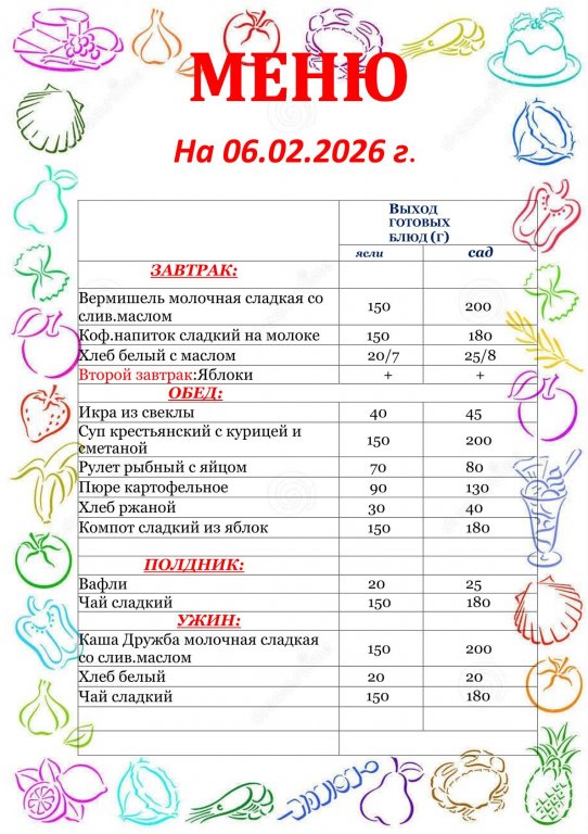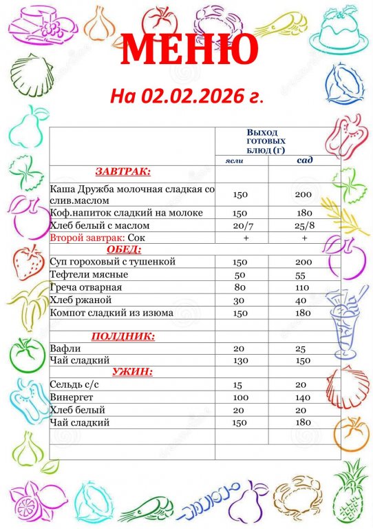 - Особое внимание уделяется объёму пищи, который строго соответствует возрасту ребёнка, а также рациональному питанию. Меню соответствует полному, необходимому набору продуктов и соответствию соотношения белков, жиров и углеводов.