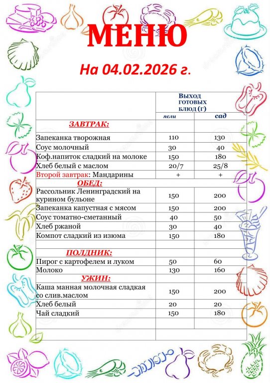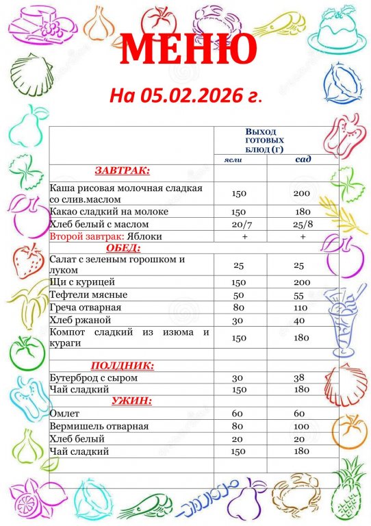 - Круглый год дети получают свежие овощи (помидоры, огурцы) и фрукты (апельсины, яблоки, груши, бананы).