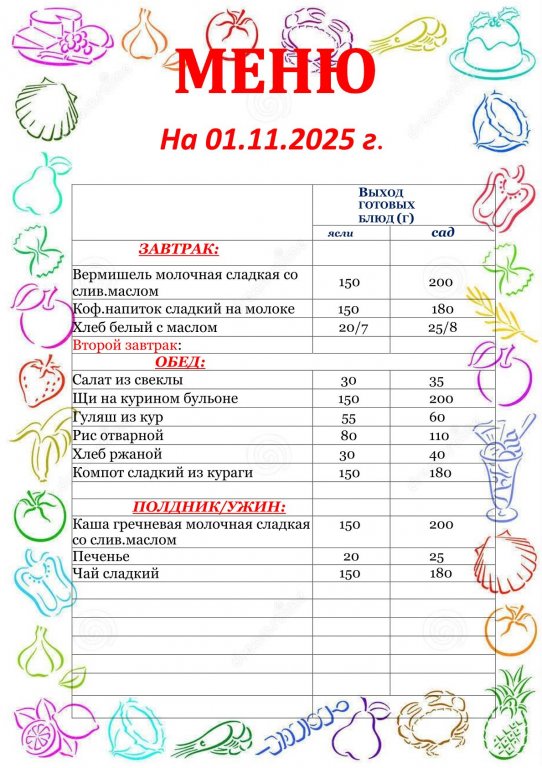 - Круглый год дети получают свежие овощи (помидоры, огурцы) и фрукты (апельсины, яблоки, груши, бананы).